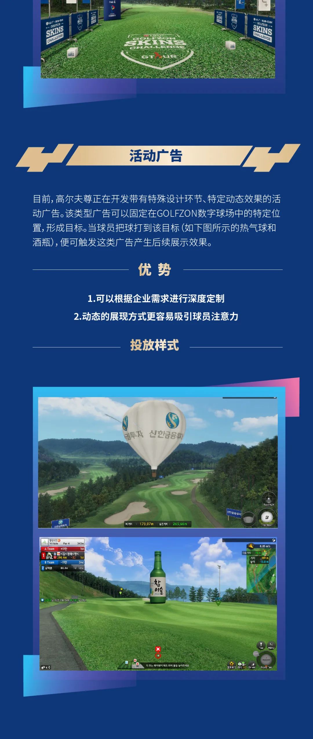 以高尔夫模拟器为媒介的高尔夫尊广告传播平台,可为客户开拓更加丰富的传播渠道、更加多样化的传播方式,更加精准的受众群体。随着GOLFZON模拟器设备的大量售卖及新场馆的开业,这种传播方式的影响范围将持续扩大,成为企业面向高净值人群推广产品、宣传品牌的绝佳方式。欢迎各界人士与我们合作共赢。