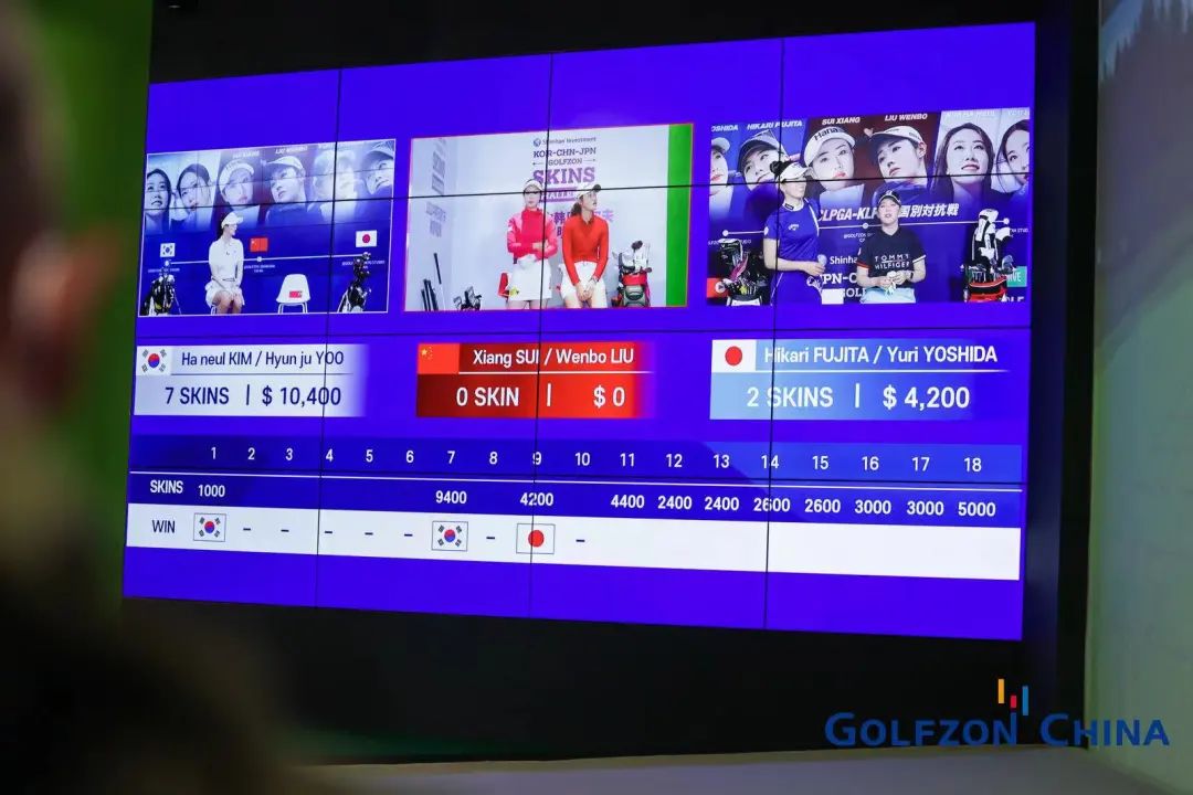 中国女子职业球员隋响、刘文博,韩国女子职业球员柳贤珠、金荷娜,日本女子职业球员藤田光里、吉田宥利分别在GOLFZON PARK上海旗舰店、GOLFZON韩国工作室、GOLFZON日本工作室同步挥杆,云上对决,为全球观众带来了一场汇聚观赏性、挑战性、专业性的元宇宙高尔夫之战。