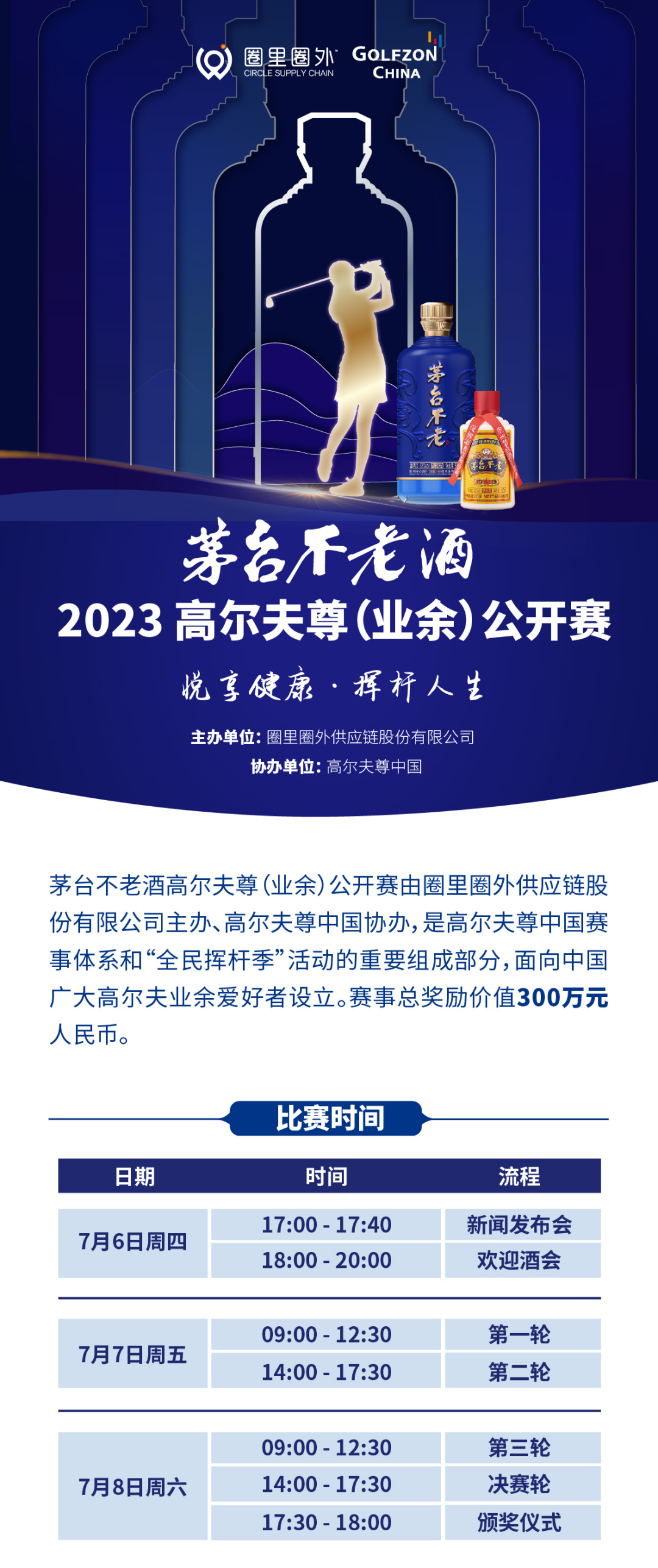 茅台不老酒·2023高尔夫尊(业余)公开赛,得到了TaylorMade、FILA GOLF、蔻之初的赞助支持。高尔夫尊中国官方战略合作伙伴咪咕,以及新浪高尔夫微博号、视频号、高尔夫尊视频号全程赛事直播。高尔夫尊中国感谢所有赞助商、合作伙伴的大力支持,也感谢所有球员的积极参与和精彩表现。