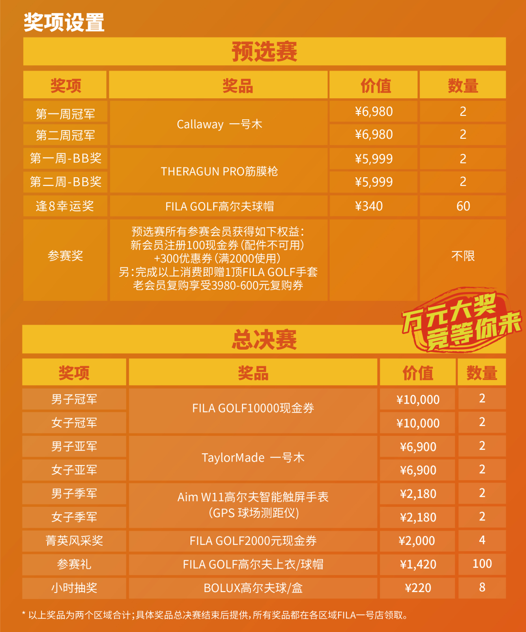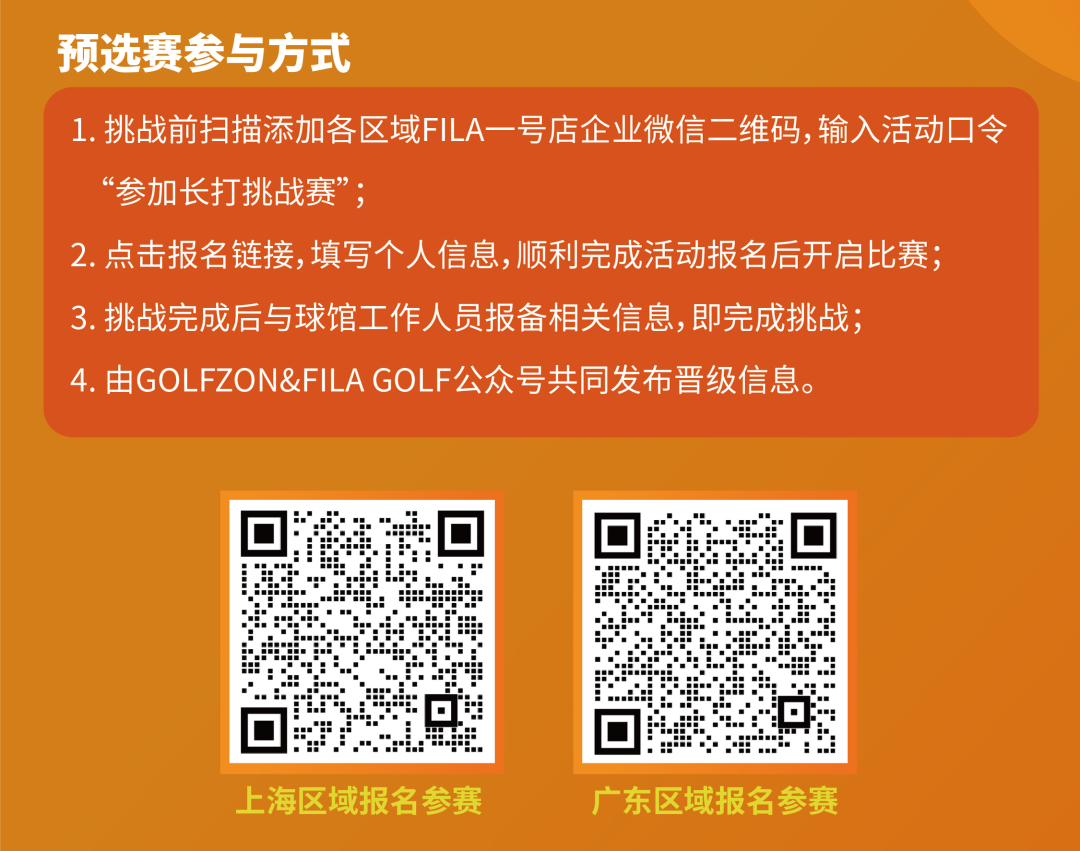 本次赛事面向上海和广东区域GOLFZON及FILA GOLF会员,比赛分预选赛和总决赛两个阶段,其中预选赛日期为5月15日至5月31日,比赛场地为FILA上海、广州一号店及GOLFZON上海、广东地区近30家球馆;总决赛日期为6月10日(上海区域),6月17日(广东区域)。各区域50位晋级球手将汇聚FILA上海&广州一号店,角逐最终胜负。赛事各赛段都设置了丰厚的奖励,所有水平参赛会员都有机会获得FILA GOLF及GOLFZON CHINA提供的百余个奖品!悦动优雅,美好如约而至,孟夏全力挥杆!以运动引领优雅品味的生活方式,以精彩挥杆引领全民高尔夫时尚风潮。5月15日,大赛开始,欢迎广大菁英前往参与赛事。世界百年运动品牌FILA GOLF与世界高尔夫模拟器领军品牌GOLFZON CHINA,两个深植于高尔夫运动的全球知名品牌,正在通过FILA GOLF & GOLFZON CHINA菁英长打挑战赛,碰撞出激情的火花。这不仅是一次简单的赛事合作,也是两个高端优秀品牌的探索尝试,更是双方成为战略合作伙伴的起点。双方通过品牌连接、活动深度定制,从而带动双方品牌的认知度和销量提升,用菁英赛事激活市场,传递品牌温度,撬动未来无限惊喜,将专业运动与优雅时尚相互碰撞,赛出菁英智感与高球精神。对于中国高尔夫市场、体育运动市场,甚至更加广泛的商业市场,双方以FILA GOLF & GOLFZON CHINA菁英长打挑战赛树立合作典范,吸引更多人关注,在强强联合中为市场拓宽思路,注入强大的新生动力。